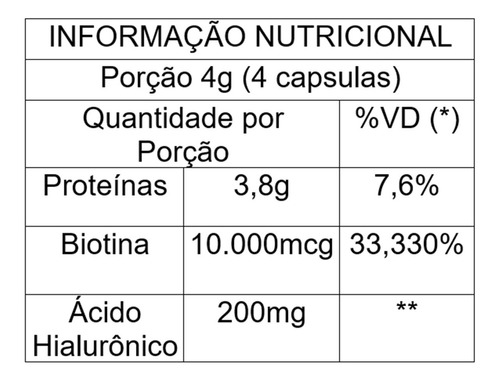 Ingredientes: Peptideos de Colágeno Verisol, Biotina (Vitamina H) e ácido Hialurônico. Capsula: gelatina e água. NÃO CONTÉM GLÚTEN.